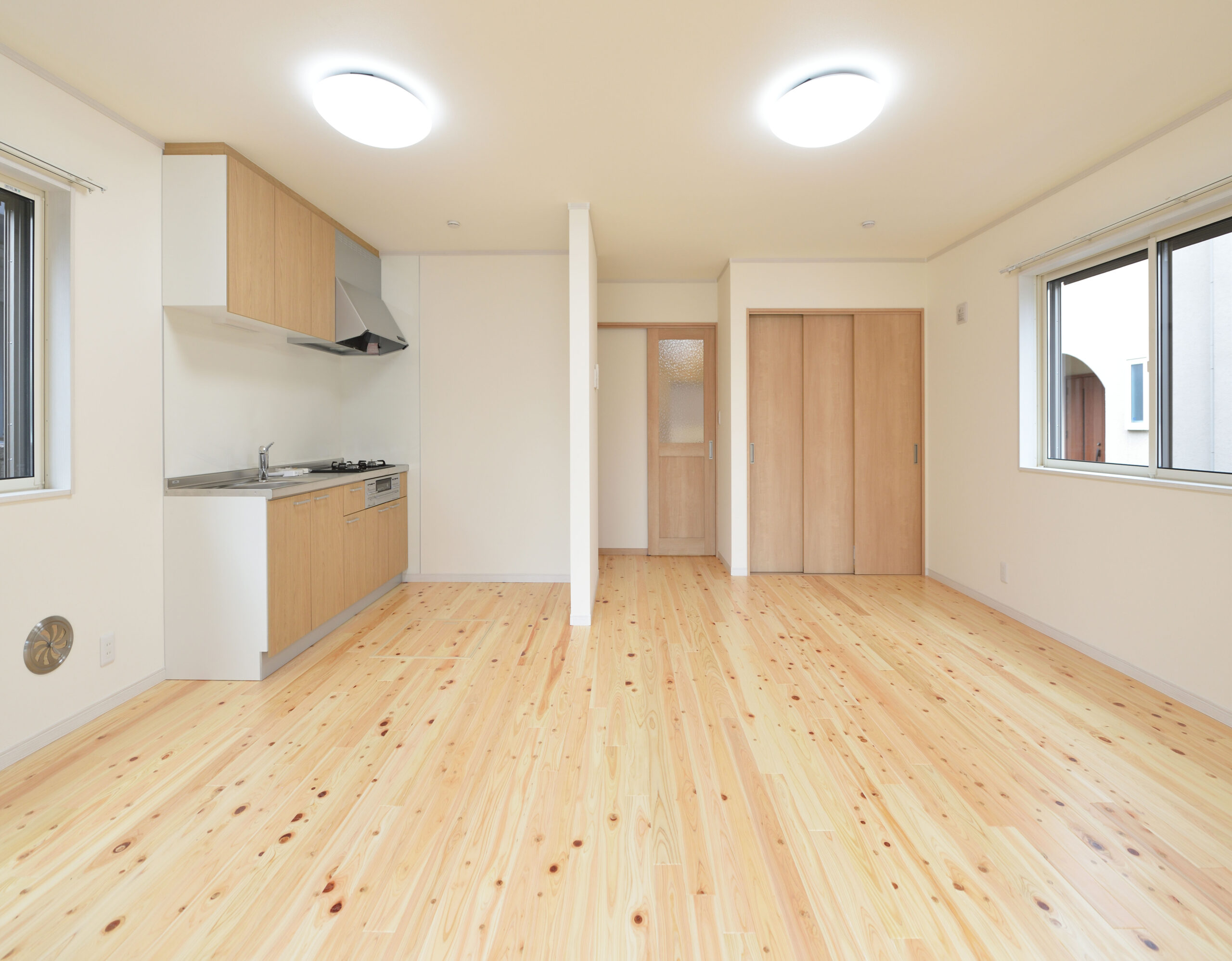 居住部分の床は檜の無垢フロアーをご採用頂き、自然素材を感じることの出来る内装となっております。