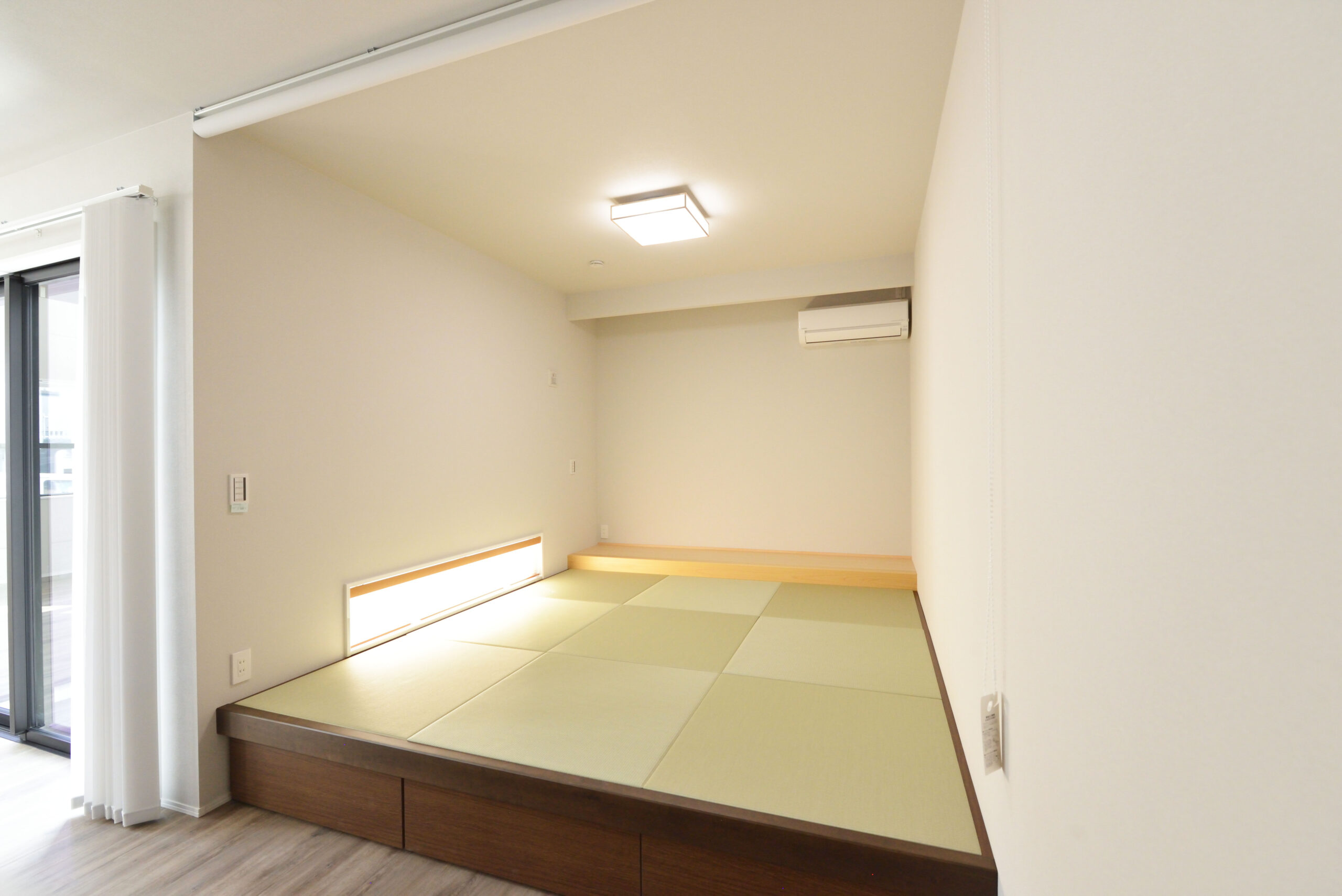 1階は電動シャッターを設置し開閉も楽々と。小上がりの収納付き畳が丘を採用し、簡単な腰掛け、または小さなお子様も遊ぶことの出来る空間となっております。